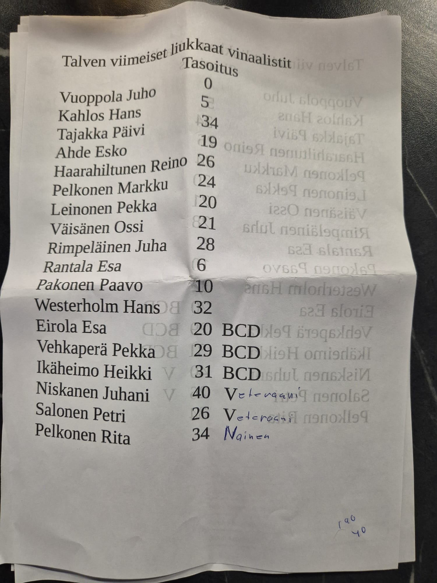Etusivu Nord Senior Tour 2025-2026 kutsu, säännötKilpailusäännöt 1.7.2025 Jälkeen alkavissa kilpailuissa pallon pinnan muokkaaminen kesken kilpailun on kielletty. Lämmittelyn aikana pallon pinnan muokkaaminen on sallittua. Oulun Keilahalli Omat kisat ja tiedotuksetKarhuKoplan kaatoapaja 23.3.2026 – 3.5.2026Kutsu / Olosuhde / Tulosseuranta Alppila Bowling Omat kisat ja tiedotukset Talven viimeiset liukkaat 17.2.-12.4.2026 Kutsu / Olosuhde / Tulosseuranta / Finalistit / Lopputulokset Potissa 9.4 1756€Kerta Rysäys 14.4.2026Kutsu / Olosuhde / Tulokset Boulis Kempele Omat kisat ja tiedotukset